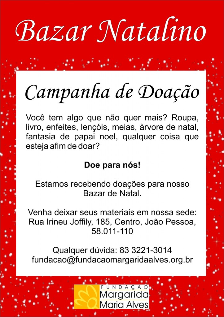 Parte integrante da programação da Fundação de Defesa dos Direitos Humanos Margarida Maria Alves, o Bazar Natalino vem ocorrendo todo ano no mês de dezembro e tem como objetivo arrecadar fundos para melhorias na sede da entidade e seus projetos. Nesse mês de novembro, a Fundação faz campanha para que seus amigos, colaboradores e sociedade em geral façam doações de roupas, livros, enfeites, materiais natalinos, e produtos que não queiram mais para serem vendidos no bazar.